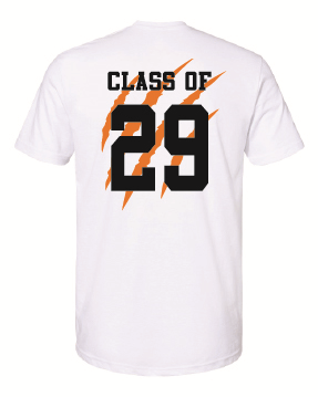 Show off your Wildcat pride with the official LHS Class of 2029 T-Shirt! Freshmen — this one’s for you, this sleek white tee features a bold orange paw print logo on the front and an eye-catching “CLASS OF 29” design on the back with fierce claw marks that show your spirit and strength.